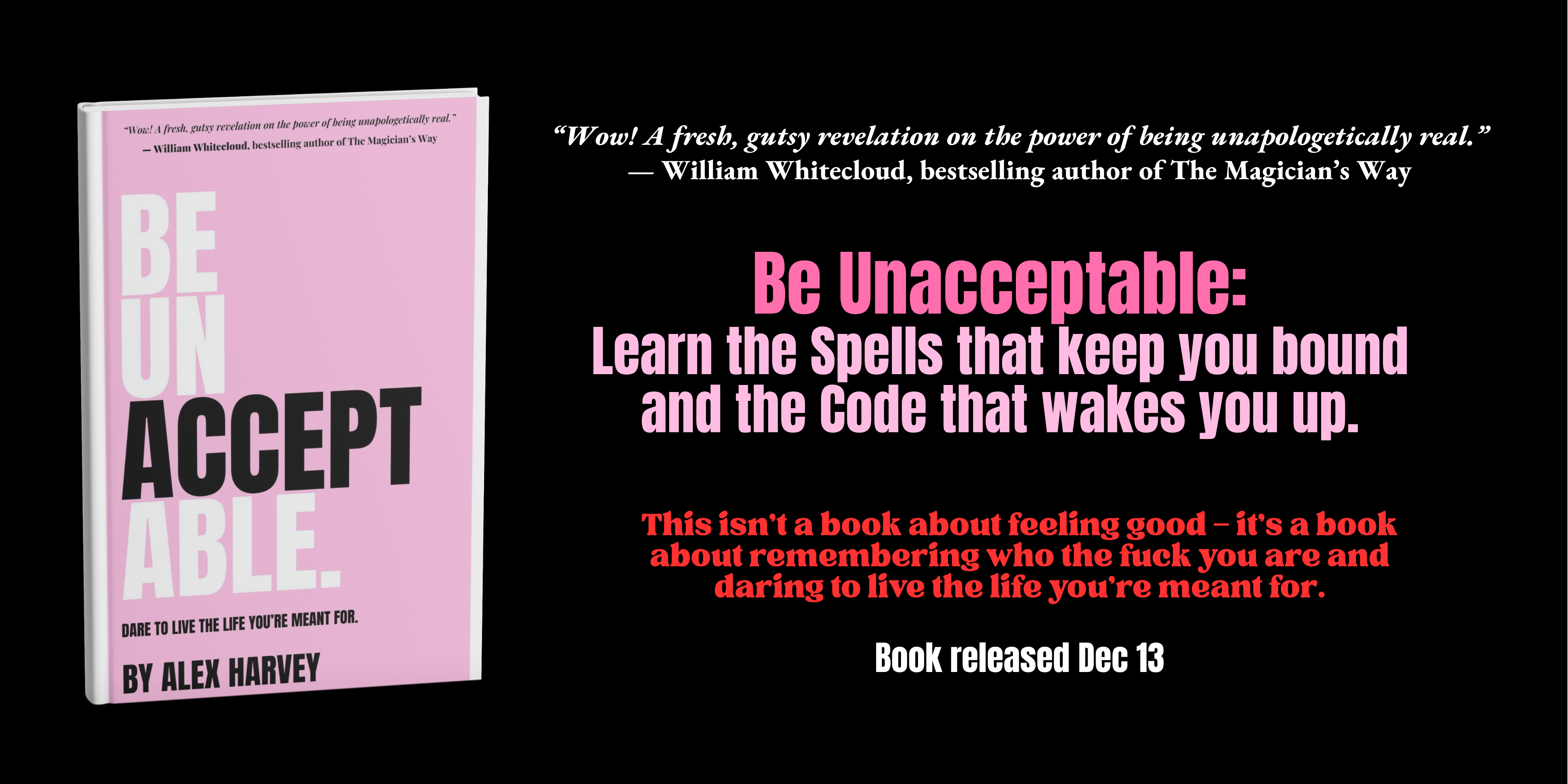 “Be Unacceptable is a brave and deeply personal journey into the psyche. Alex Harvey’s honesty is raw, unguarded, and offered with a genuine intention to help readers recognise their own inner landscapes.